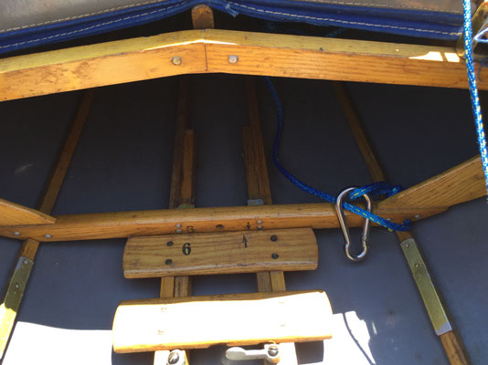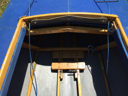 Dadurch sollen die auftretenden Kräfte besser verteilt werden und Beschädigungen durch die Klemmvorrichtung am Holzgerippe verhindern. Die Halterung ist mit elastischen Zwischeneinlagen am Faltbootrahmen festgeklemmt und lässt sich jederzeit rückstandsfrei entfernen.